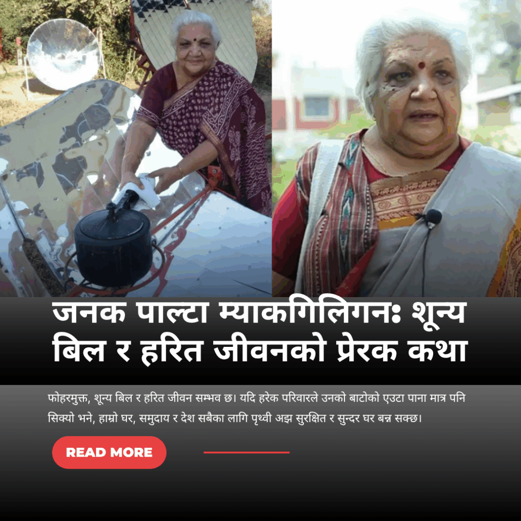 विश्व अहिले तीव्र गतिमा बढ्दो उपभोग, प्रदूषण र जलवायु संकटको सामना गरिरहेको छ। आधुनिक जीवनशैलीले सधैं सुविधा र विलासितामा जोड दिन्छ, तर त्यसको मूल्य पृथ्वी तिर तिर्नुपरेको छ। आजको संसारमा जहाँ प्रत्येक महिनाको बिजुली, पानी, ग्यास, र फोहरको बिलले मानिसलाई थकित बनाउँछ, त्यही समयमा भारतको इन्दौर नजिक सनावडिया गाउँकी पद्मश्री जनक पाल्टा म्याकगिलिगनले आफ्नो जीवनलाई यति आत्मनिर्भर र पर्यावरणमैत्री बनाएकी छन् कि — उनको घरमा बिजुलीको बिल शून्य, पानीको बिल शून्य, फोहरको बोरा शून्य र जीवनयापन खर्च लगभग शून्य छ। तर यो केवल जीवनशैली होइन — मानवता र पृथ्वीप्रतिको उत्तरदायित्वको प्रतीक हो।